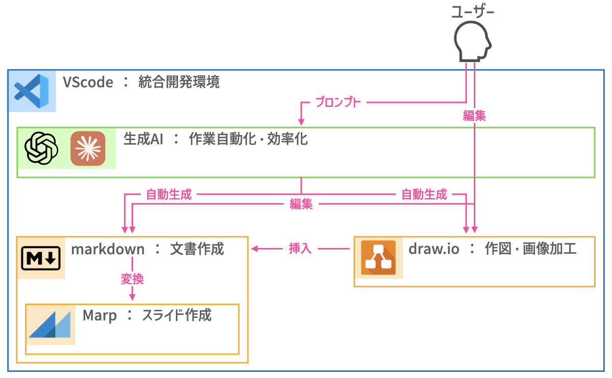タイトルの通り、markdown × Marp × draw.io × 生成AIによるVScode完結のスライド作成方法になります!