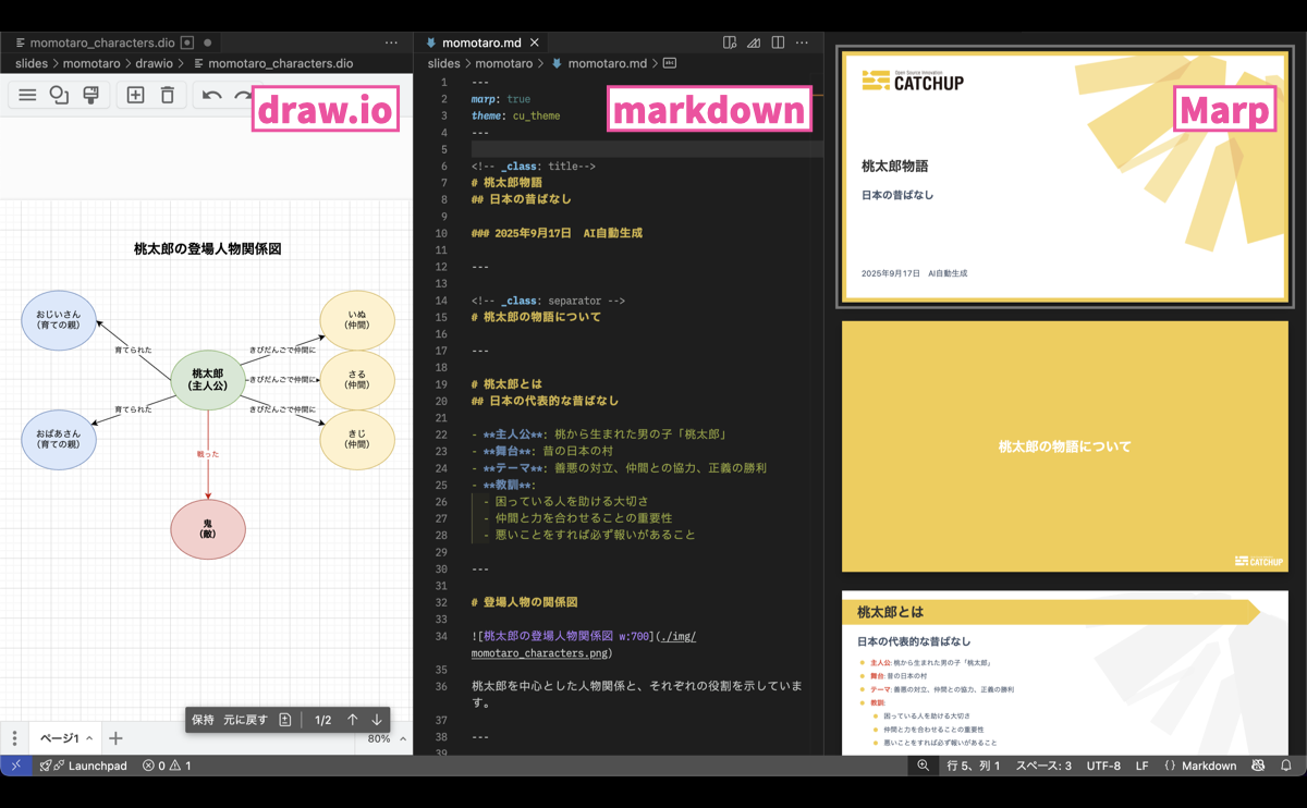 Marp・draw.io・生成AIとの連携、いずれかの情報がみなさまの興味・関心へつながれば幸いです。