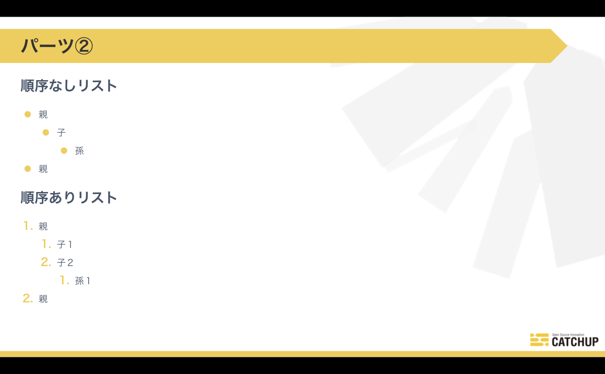 見出しやリストなど一般的なmarkdown記述をするだけでリアルタイムにスライドへ変換してくれます。