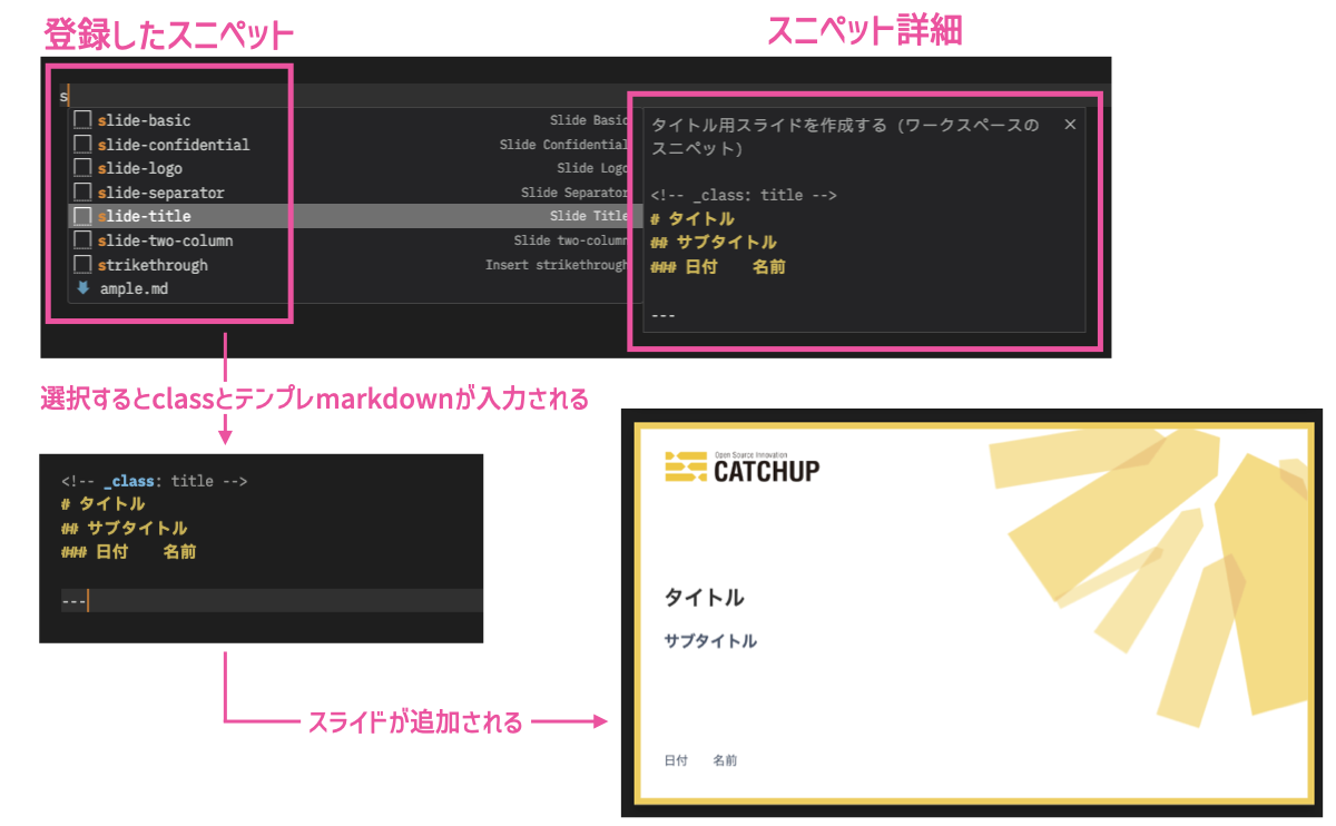 Marpそのものの特徴というよりはVScodeで使うアプリの特徴という感じではありますが、各スライドのクラス名やテンプレートの記述をスニペット登録することができます。