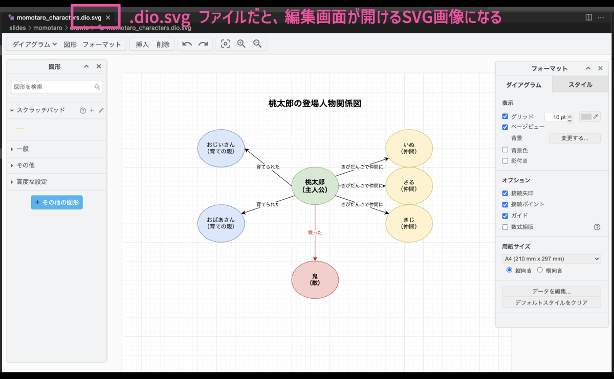 「桃太郎について5枚のスライドで説明してください。登場人物の関係図をdraw.ioファイルで作成したものをスライドに貼り付けてください。」