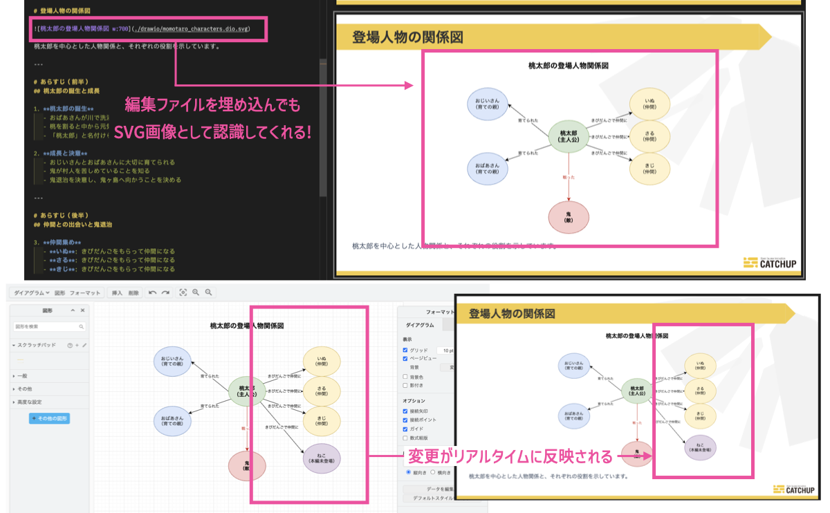 つまり、markdownにdraw.ioの編集ファイルをSVG画像として埋め込むことができます!