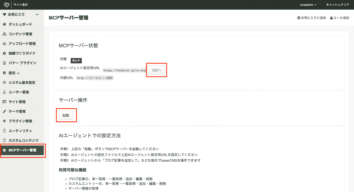 baserCMSの管理画面にて、「設定 → MCPサーバー管理」に移動し、サーバー操作欄の「起動」ボタンをクリックします。これでMCPサーバーが起動します。
