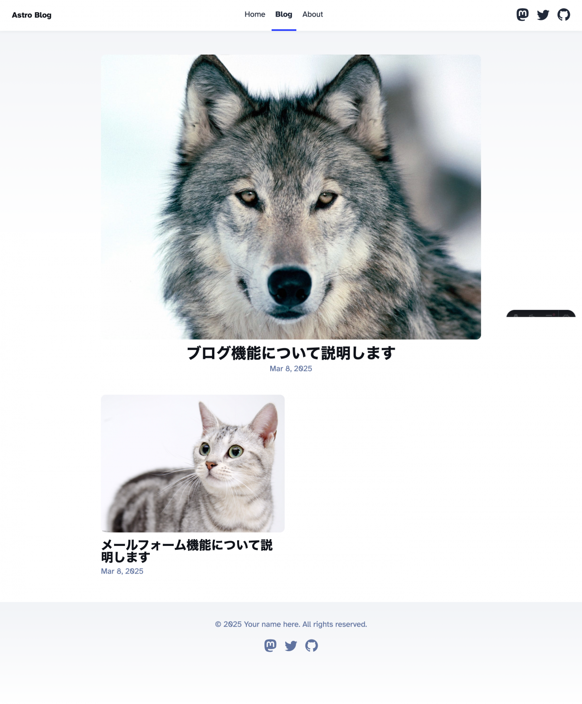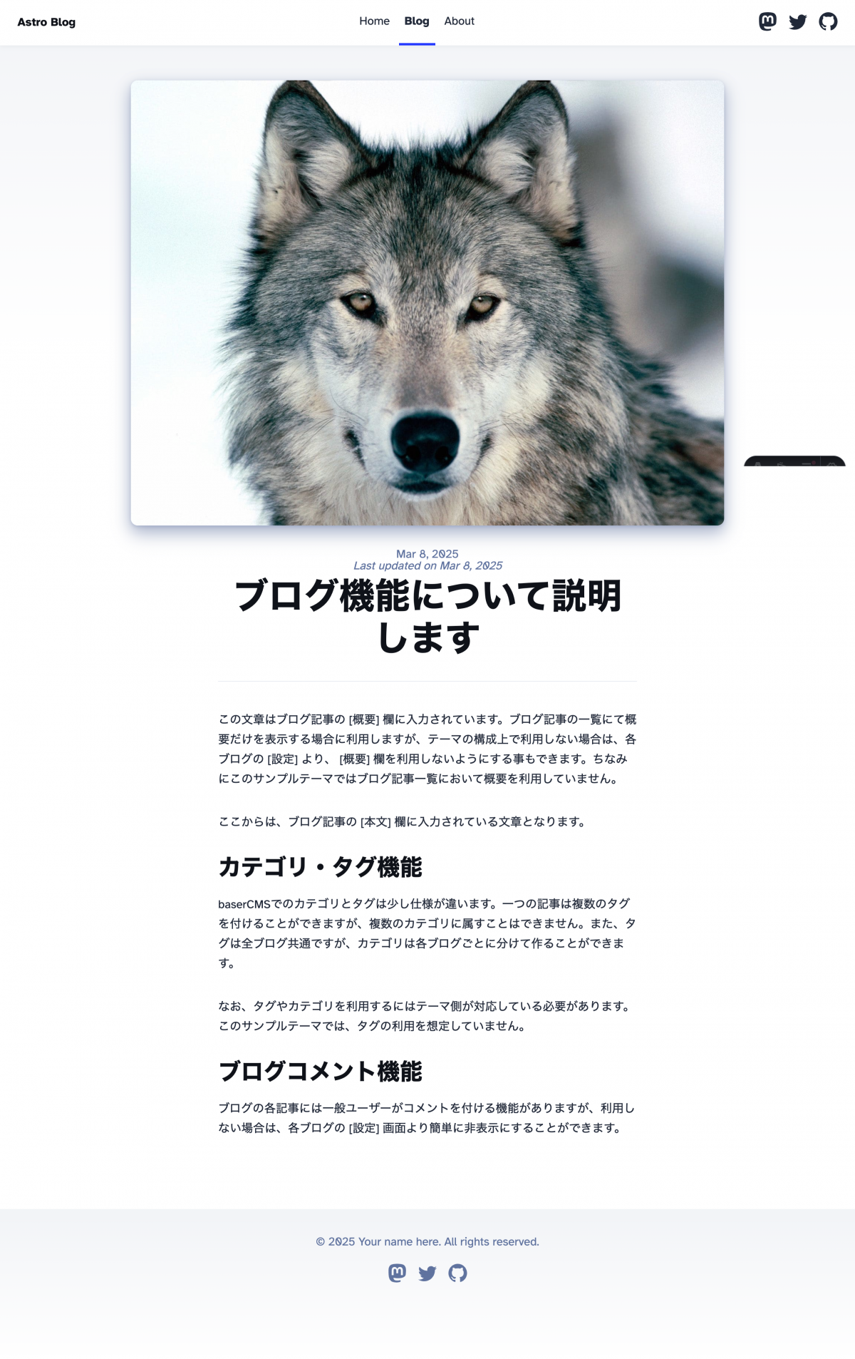 Astro の既存のブログテンプレートをベースとして、SDK経由でbaserCMSのブログ記事を読み込んでいます。